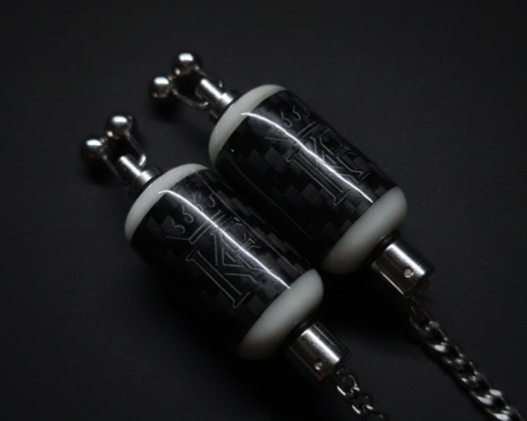 Deze carboncore bobbins zijn afgewerkt met spiraal geweven zwarte japanse 3K carbon van hoge kwaliteit en witte glow in the dark endcaps welke s'nachts groen oplichten. De bobbins zijn uitgerust met een rvs ketting en rvs teflon lijnclip waardoor deze een zeer strakke en robuuste uitstraling hebben!