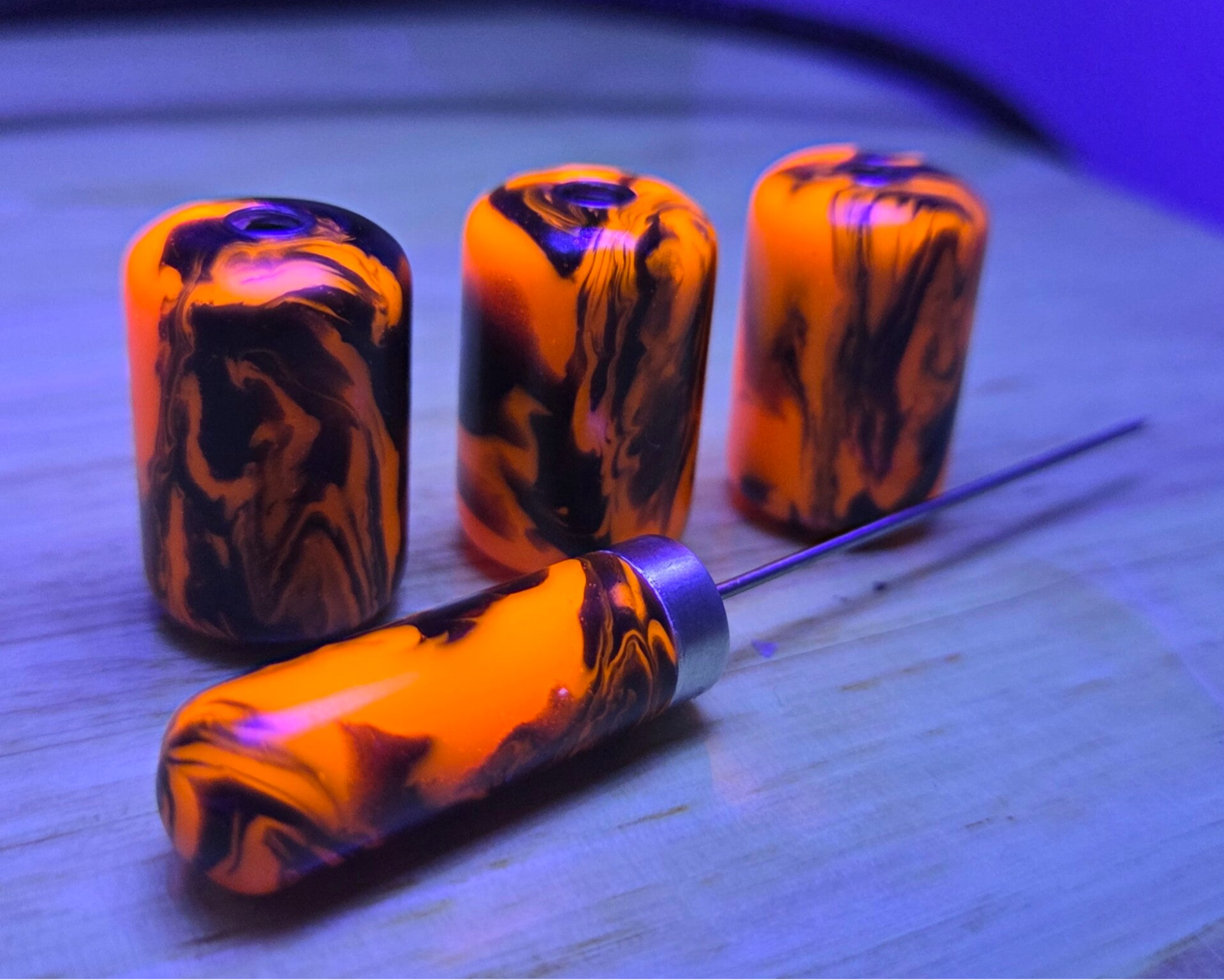 Custom made set bestaande uit 3 bobbins en bijhorende naald in metallic zwart met neon oranje.
